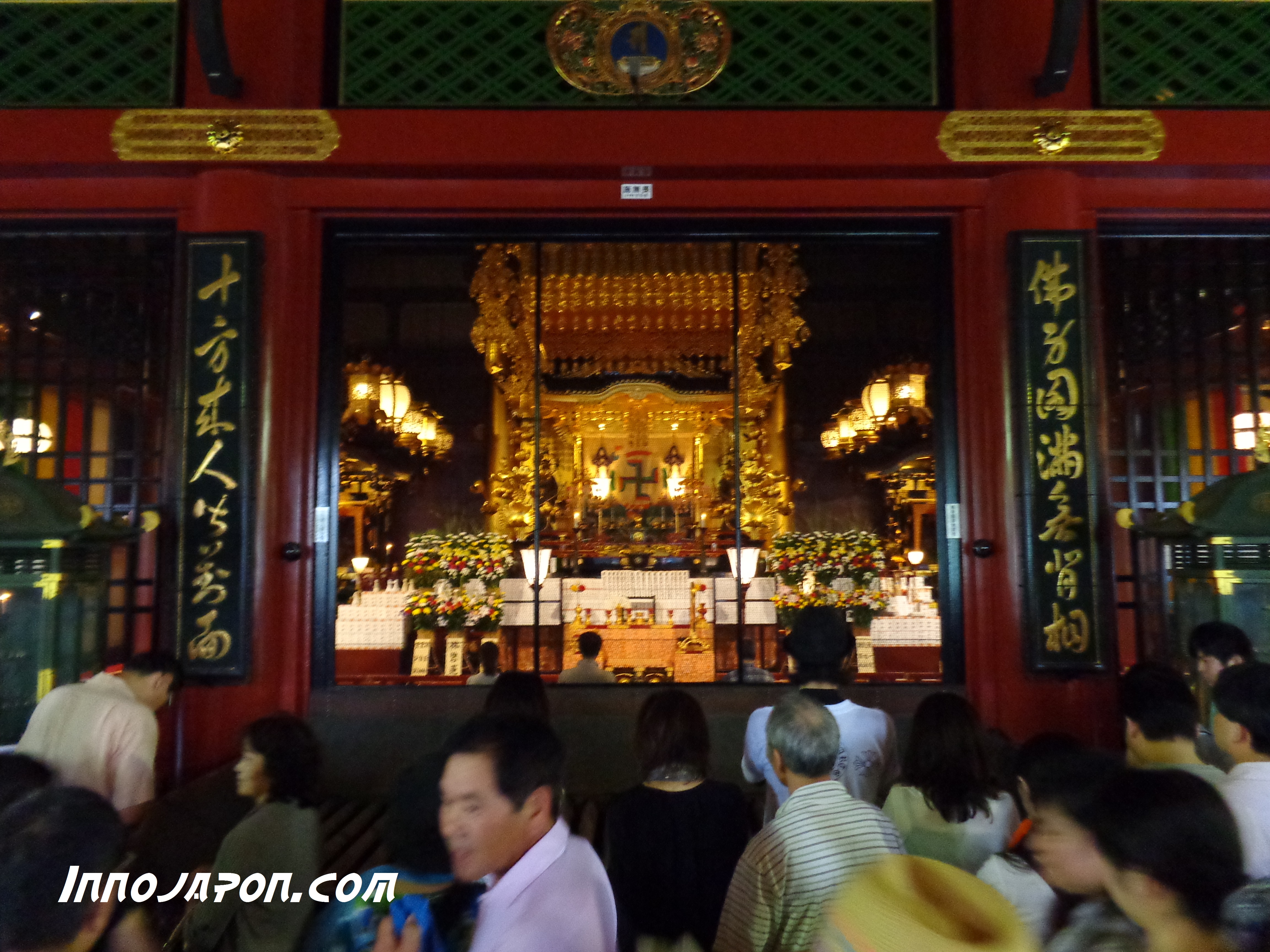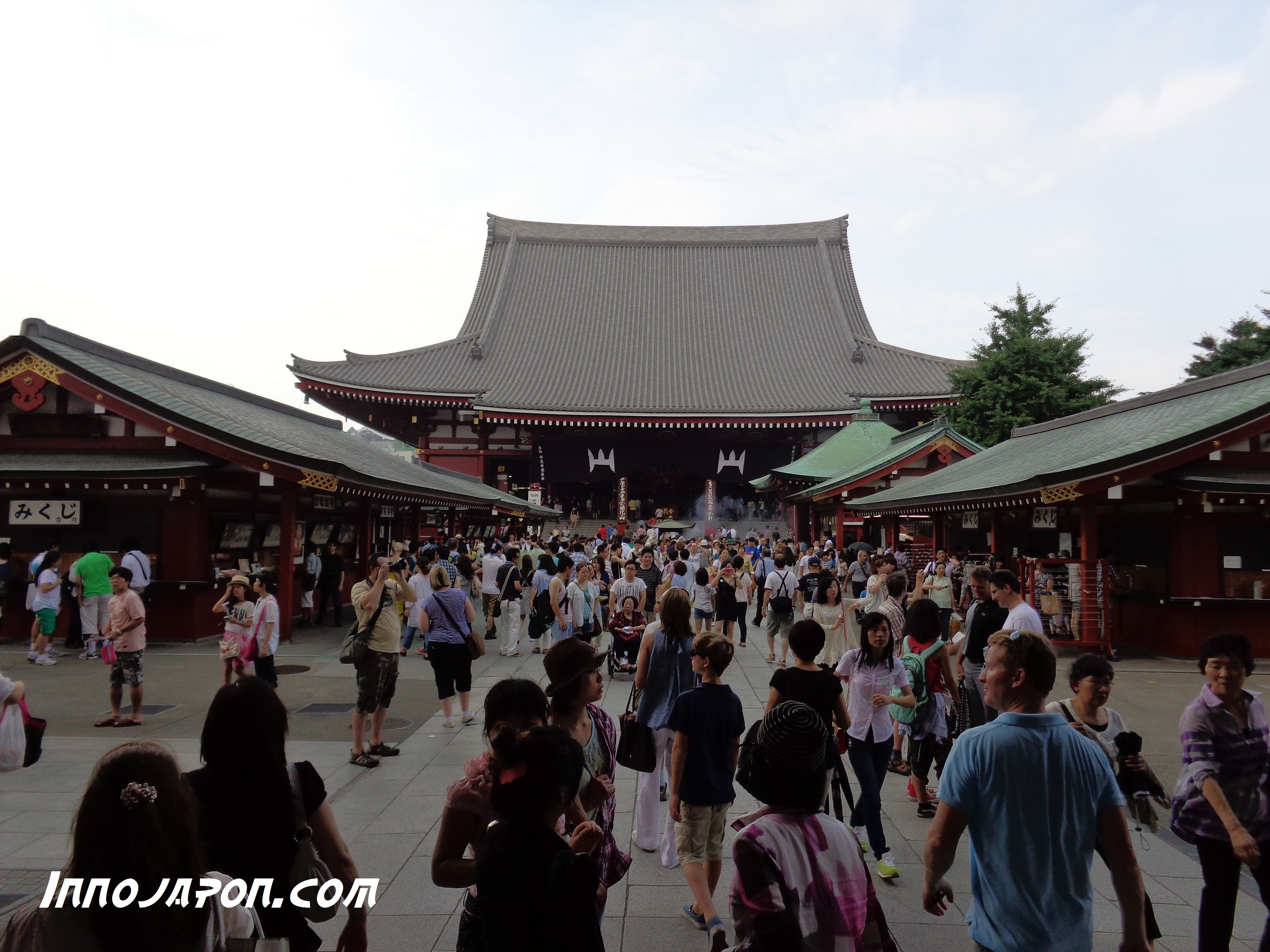 Le temple est juste à côté de la sortie de la station mais pour y accéder il faut d’abord passer par une sorte de rue commerçante bondée comme une manif parisienne ! C’était plutôt sympathique, entre les odeurs de sucré et celles des souvenirs qu’on y vend ça occupait ! Pour ceux qui se demanderaient, il y a effectivement moyen de passer outre cet endroit pour accéder au temple, mais c’est assez réputé puis ça fait partie du jeu je pense !