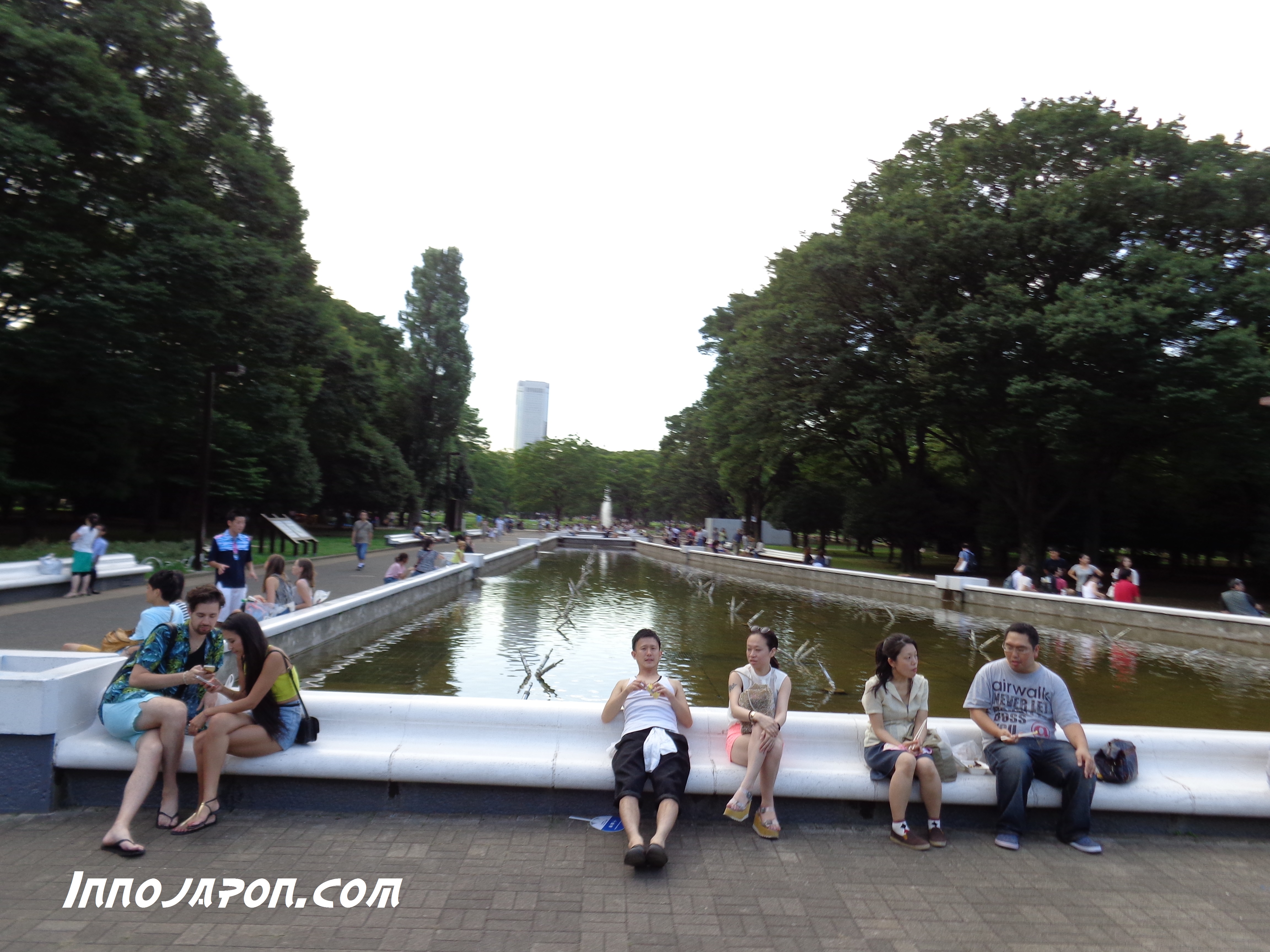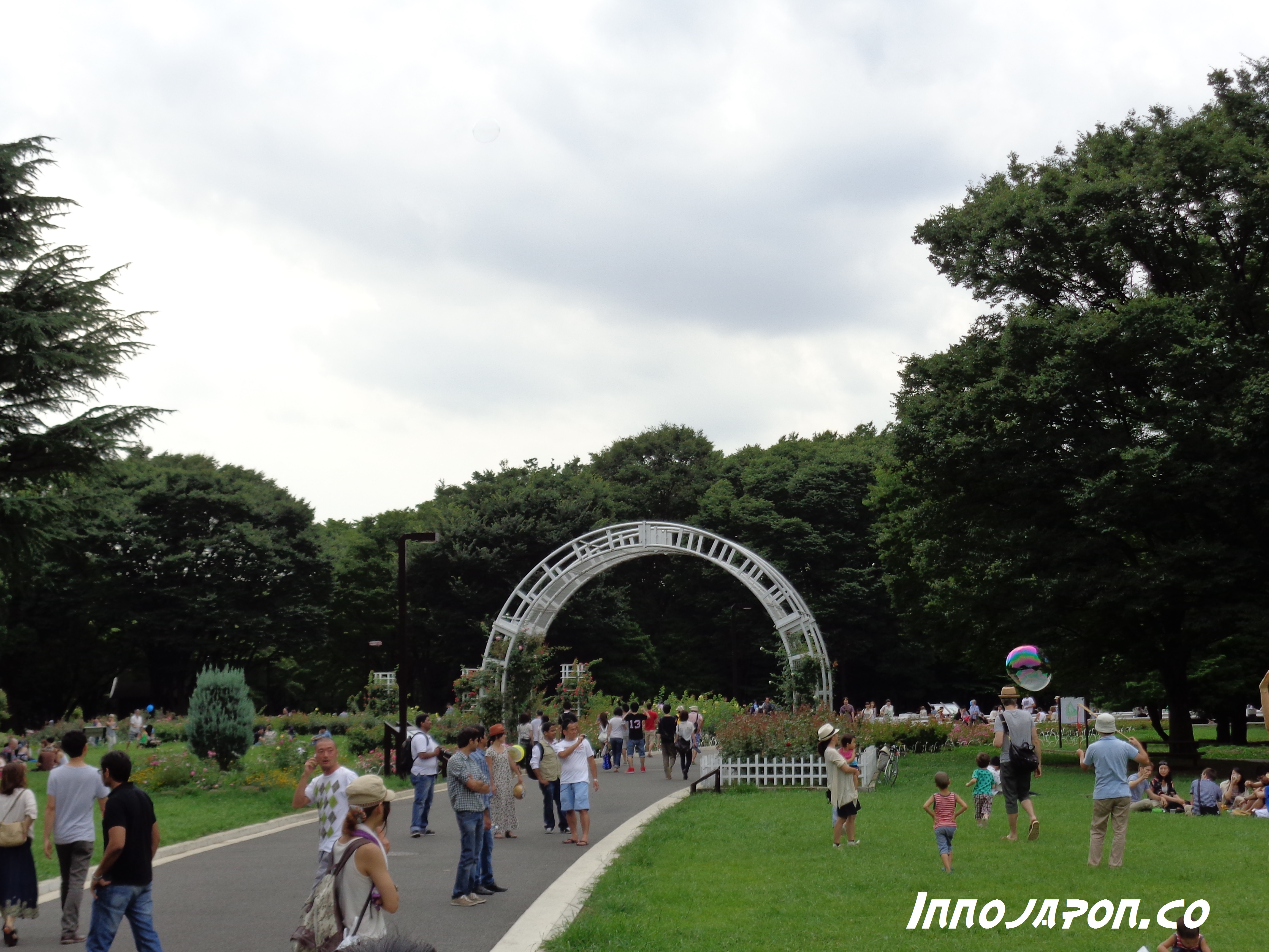 Il y a un monde fou à l’entrée du parc, foule qui ne se désempli pas à l’intérieur. C’est vrai qu’il s’agit d’une belle journée ! Au début du parc, j’apperçoi ce qui me fait grandement penser à Alice au pays des merveilles: une sorte d’arche aux roses ! Je m’enfonce un peu plus loin dans le Yoyogi cohen afin d’essayer de passer outre le monde. Les visiteurs y viennent en famille ou entre amis. On y voit des cerf-volants, des générateurs de bulles, et beaucoup d’artistes amateurs: le calme du parc est troublé par la musique des jours d’été. En réalité c’est agréable.