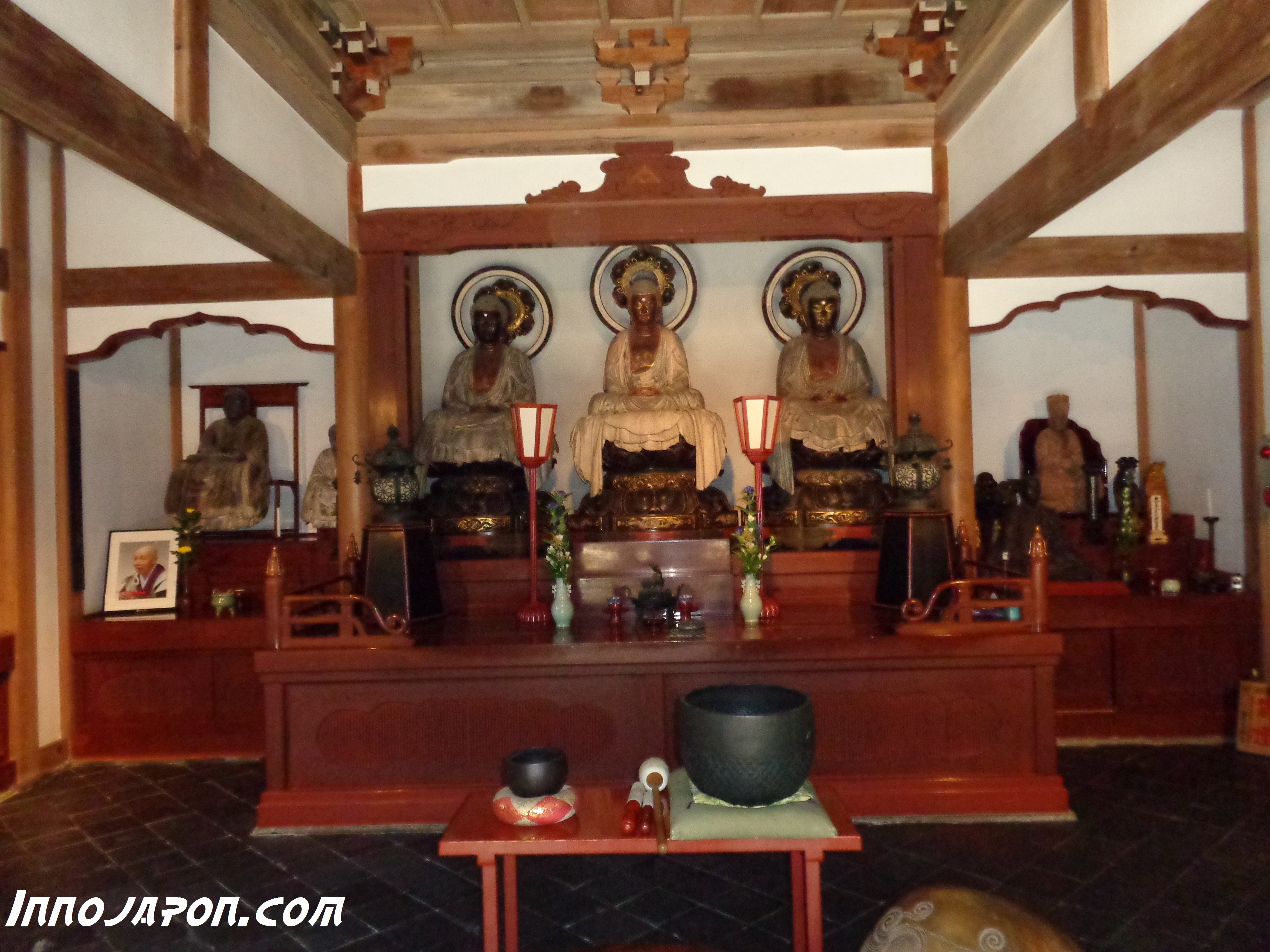 Je suis seul (et très bien ainsi) dans l’enceinte de Jochi-ji. J’aperçois trois statues de Bouddha. Je peux lire sur le côté qu’elles représentent le passé, le présent et le futur.