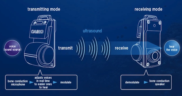 Casio a développé un masque très ingénieux et simple d’utilisation appelé Logosease. Par une petite pression sur le côté, vous allumez le le masque, puis vous parlez. Vos paroles sont transformées en ultrason qui sont alors captés par le masque de l’autre personne avec qui vous communiquez !